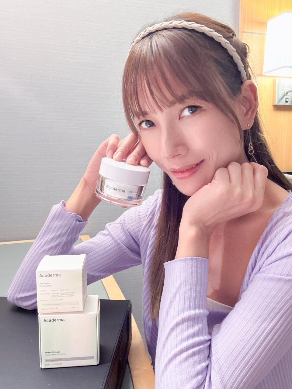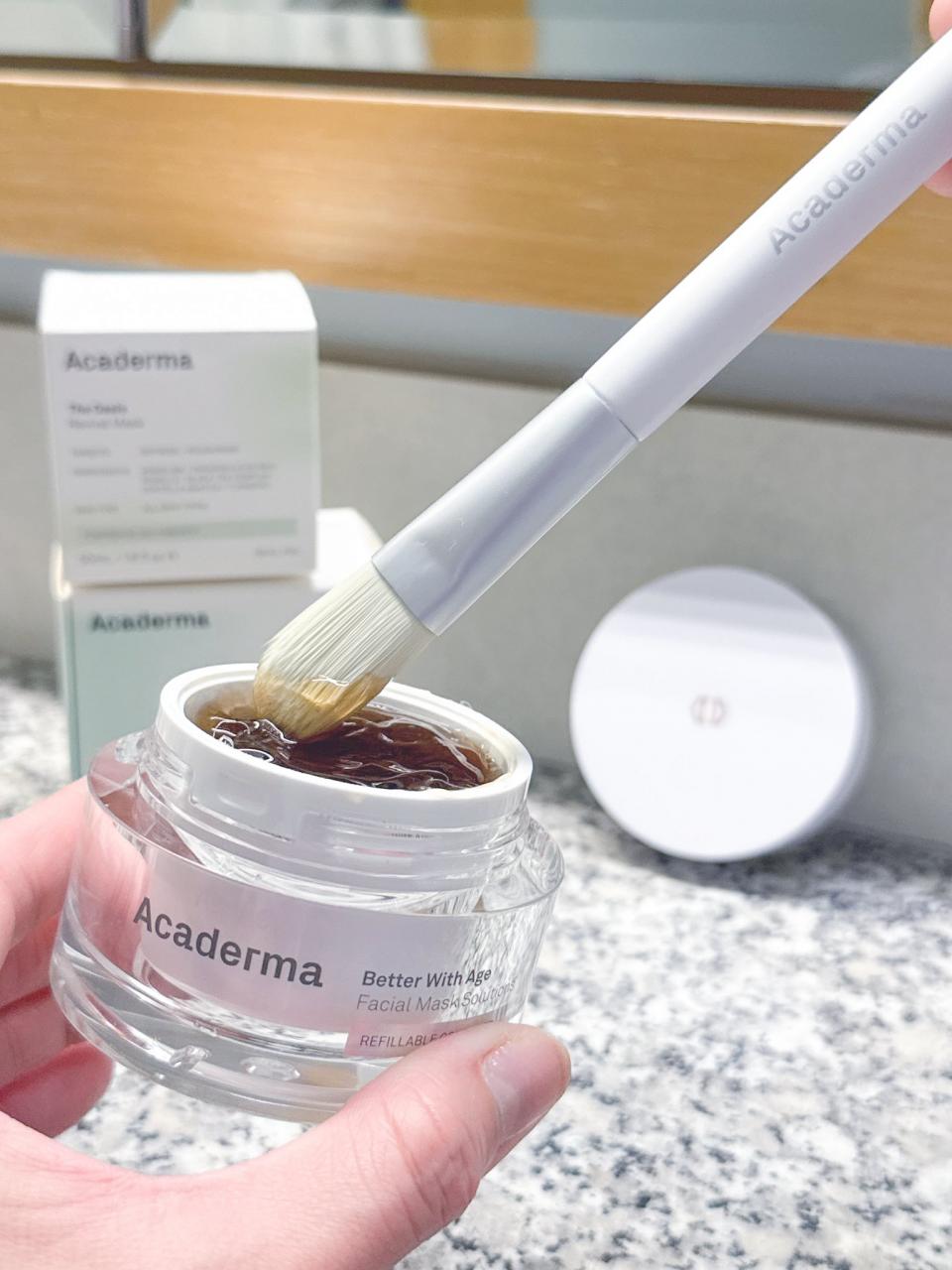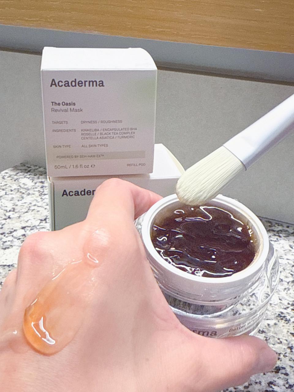 利用Acaderma面膜掃 將厚厚一層塗抹於臉部和頸部
